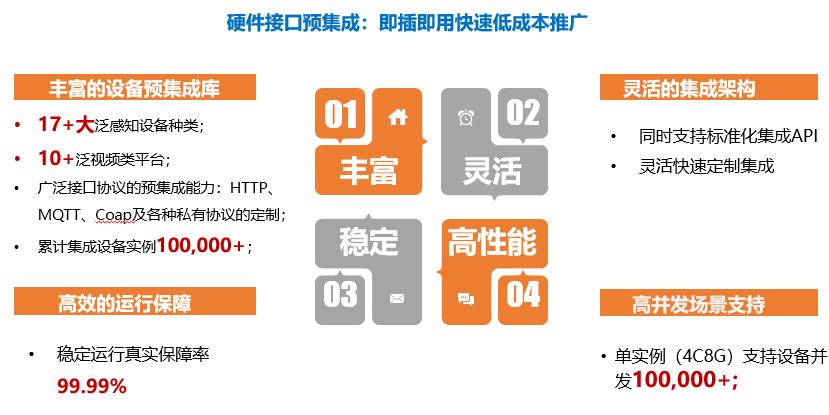 迄今庄闲和游戏公司已经预集成17+大泛感知设备种类,10+泛视频类平台,广泛接口协议的预集成能力涵盖了HTTP、MQTT、Coap及各种私有协议的定制,累计集成设备实例达100,000+。它还支持标准化集成API,可灵活快速地定制集成,通过构建规则引擎,实现了各设备间的联动应用,比如检测到违规停车,联动广播就会自动播报提醒,为社区管理服务赋能。